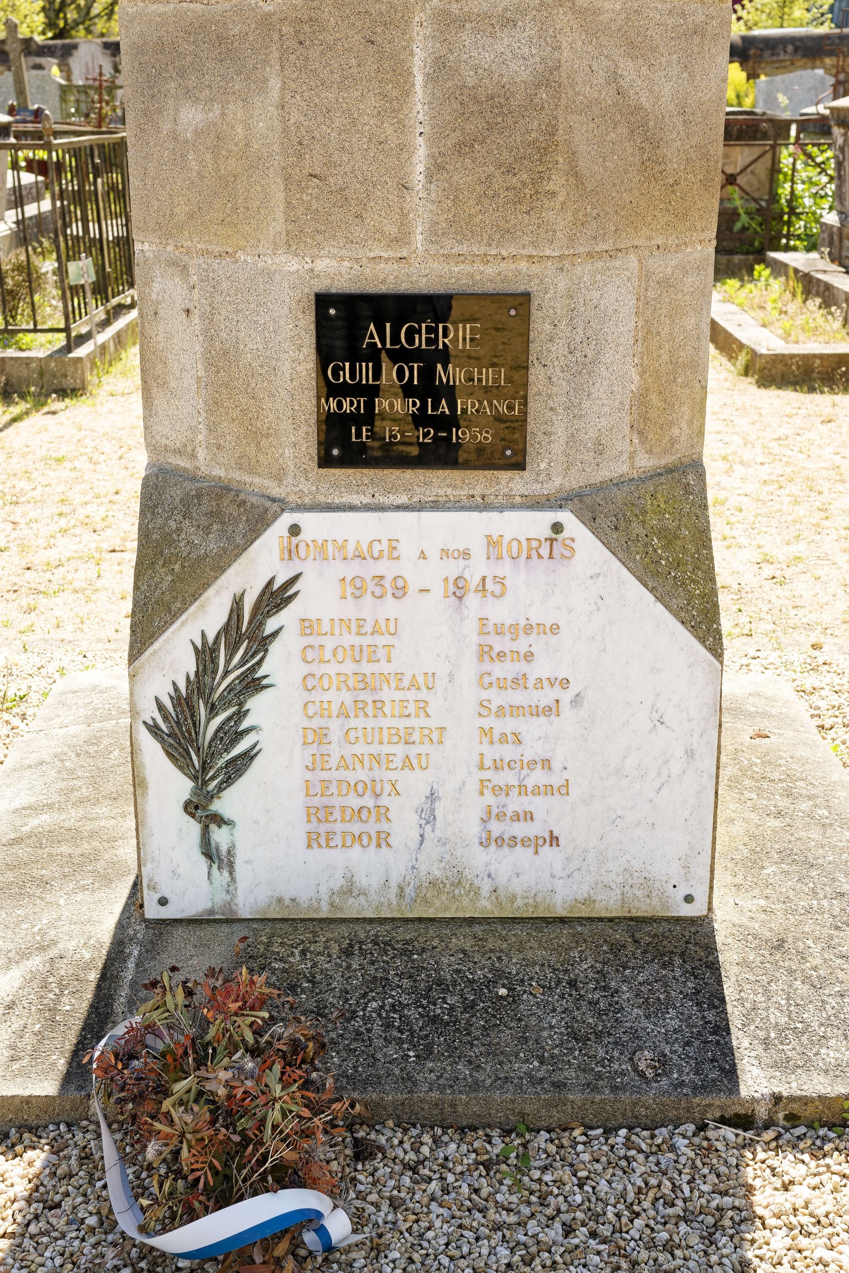 Sur la face arrière du monument, 2 plaques ont été chevillés sur la stèle en granit. Une plaque en marbre blanc, décorée d’une branche d’olivier, commérant en les listant les Martipontains morts pour la France lors de la guerre 1939 – 1945. Et une plaque plus sobre en marbre noir commérant un soldat mort pour la France pendant la guerre d’Algérie.